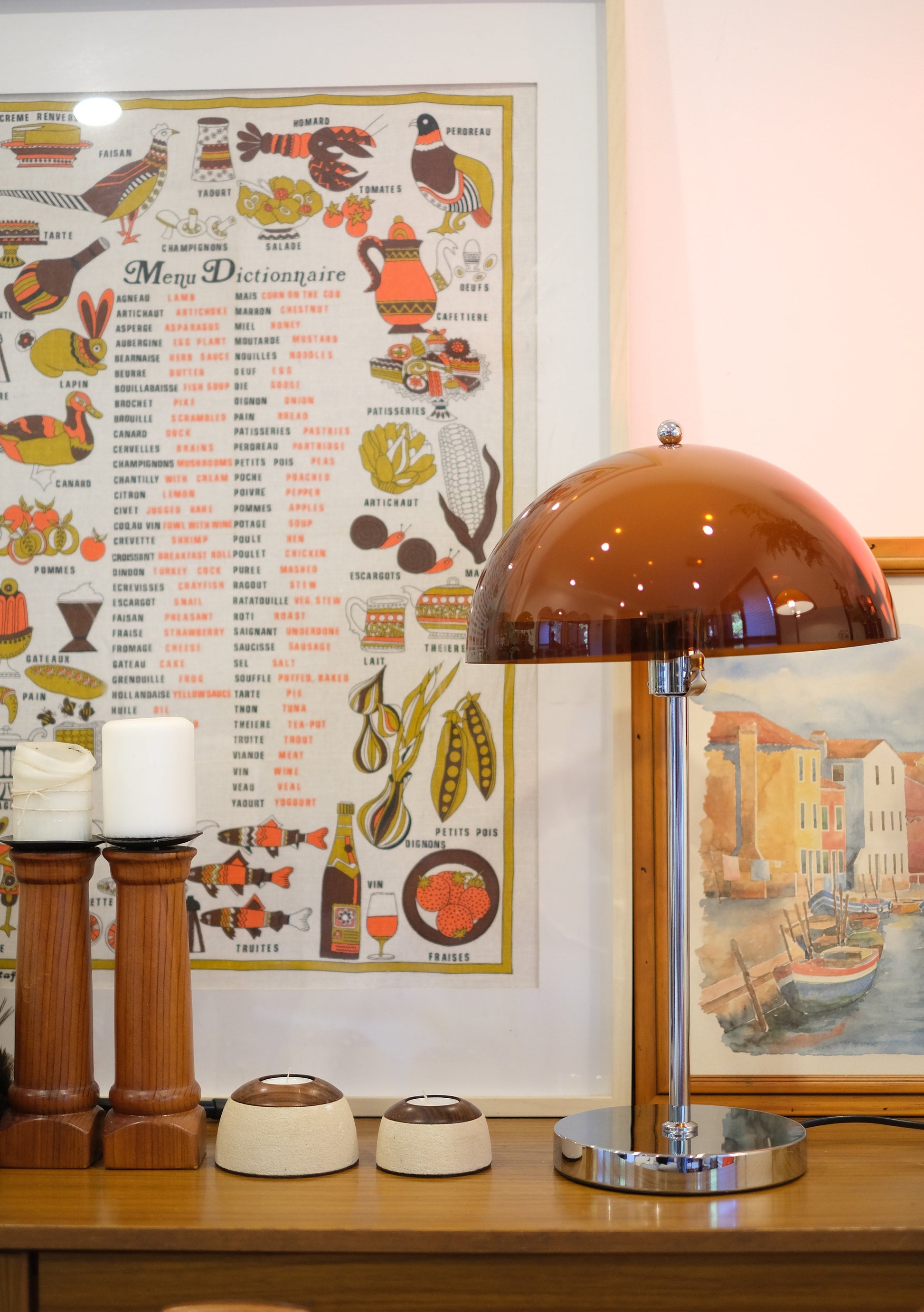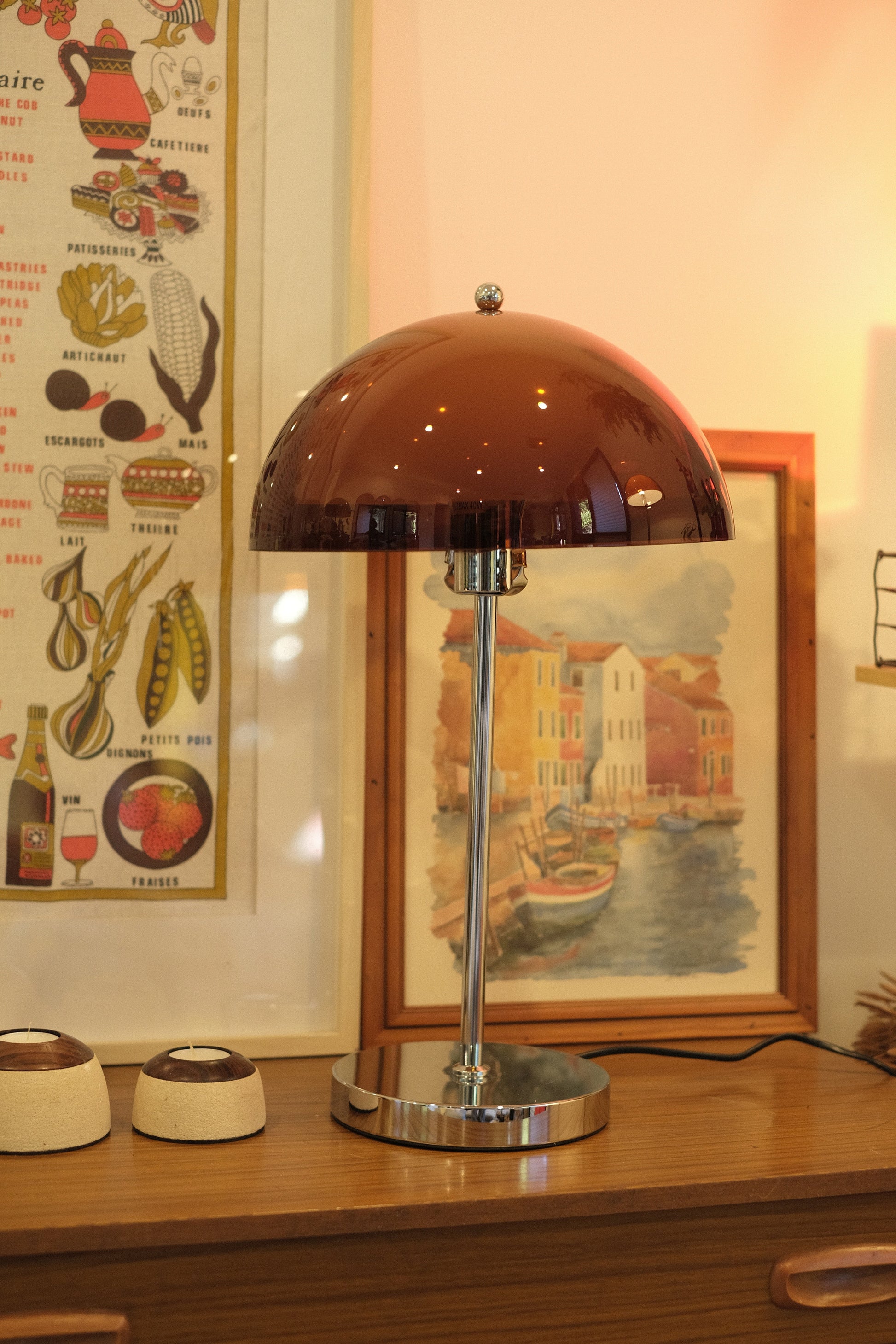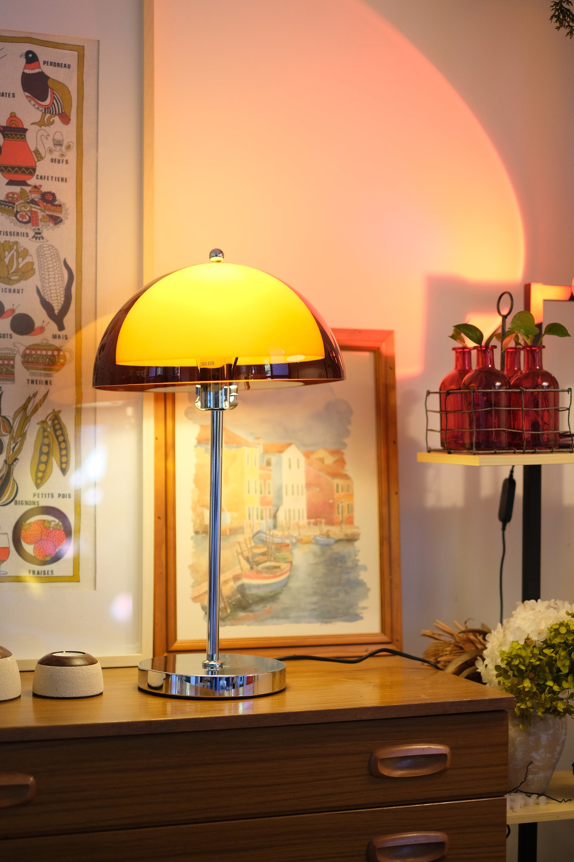 The white inner dome softens light, while the orange outer layer adds vintage flair