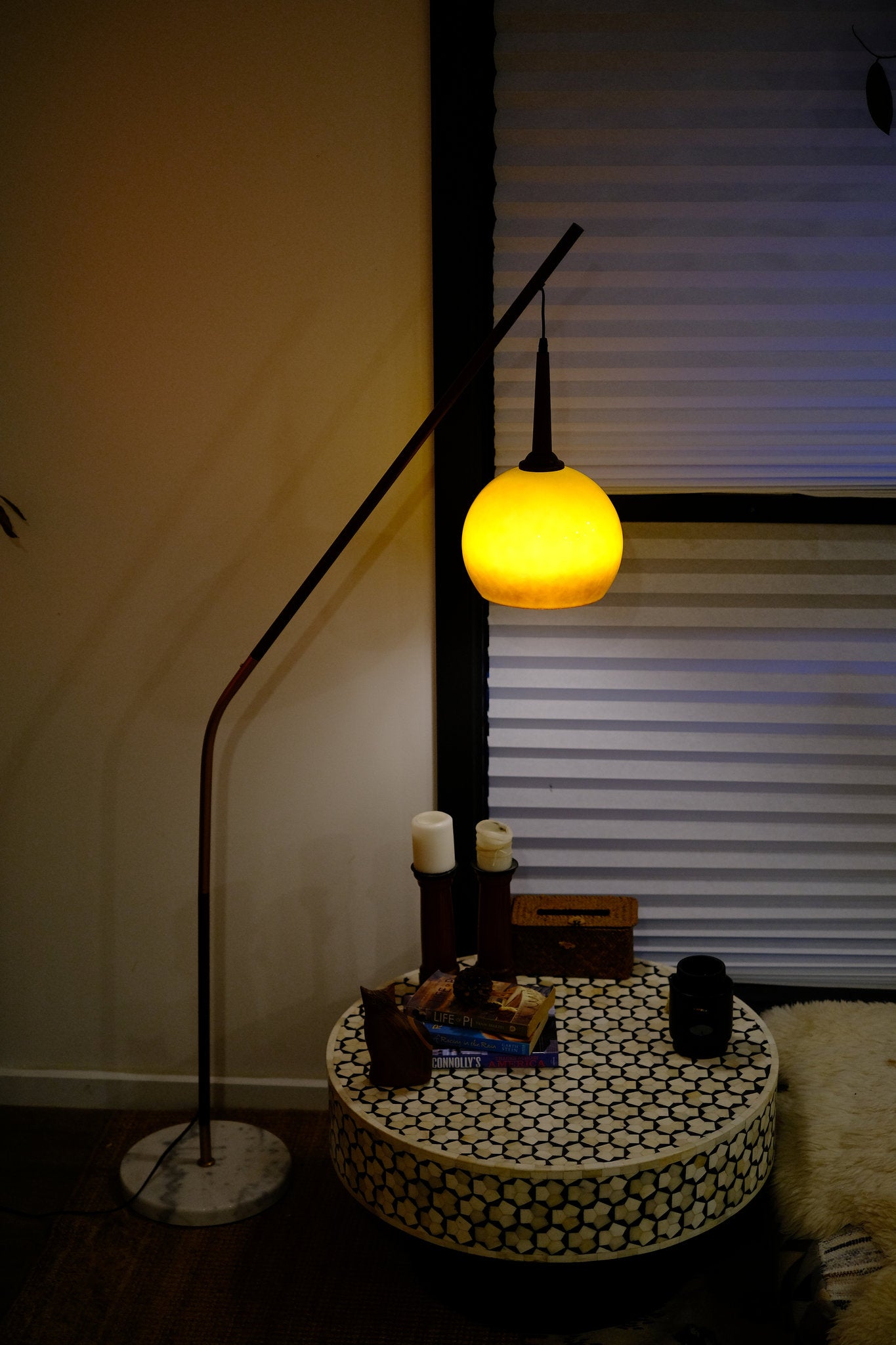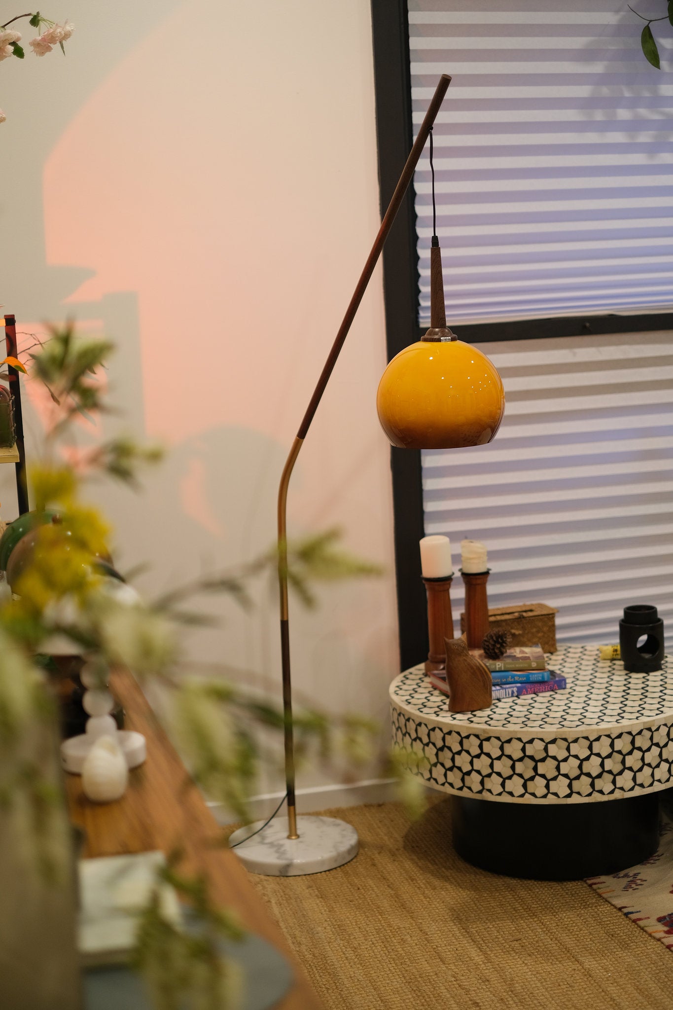Hulusi Hanging Arc Floor Lamp – Mid Century Walnut & Orange Glow